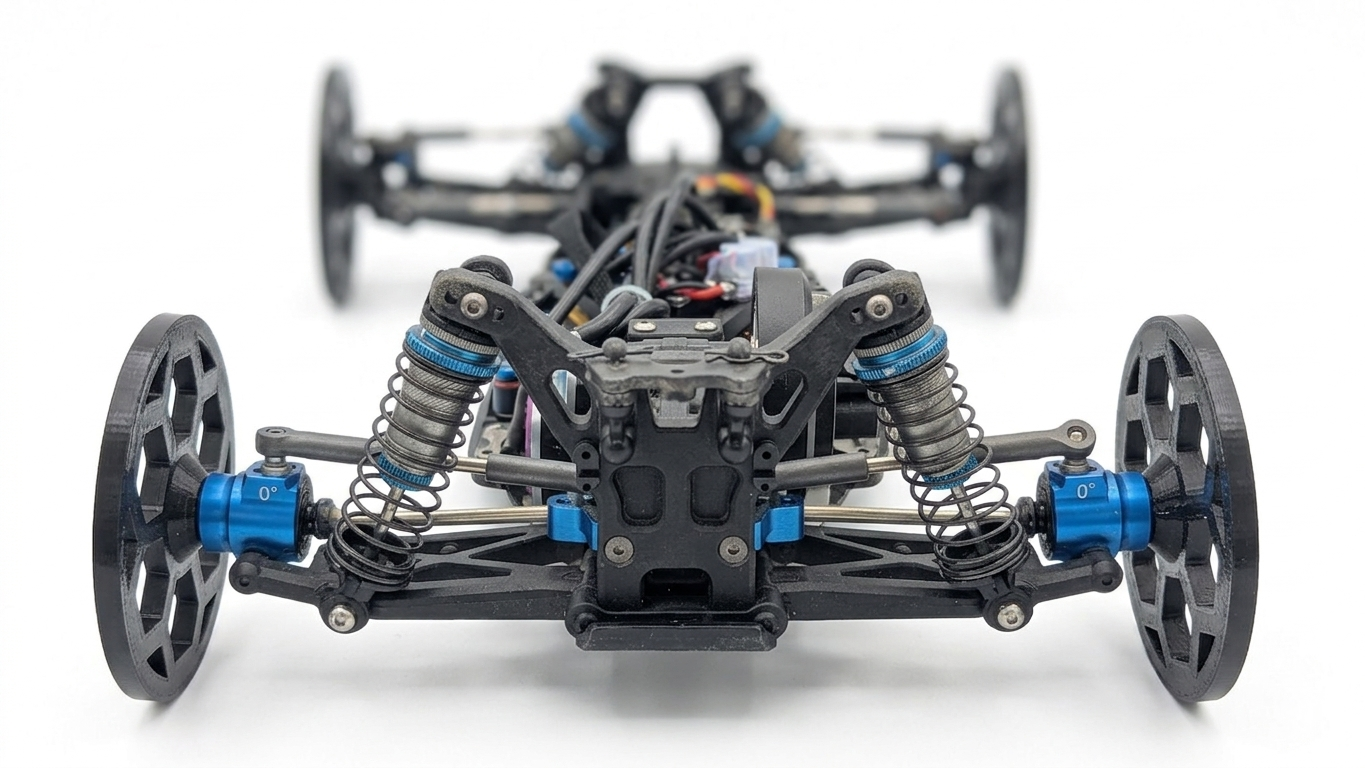 By replacing your standard wheels with a rigid, precisely printed setup wheel, you create a true flat contact surface between your car and your setup board. This allows you to measure and adjust suspension geometry without interference from tire deformation or inconsistencies. The result is a more accurate baseline setup, improved repeatability, and ultimately better on track performance.